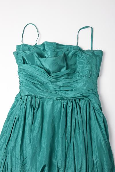 - Aftonklänning med tillhörande kappa. Grön. Klänningen med smala axelband, draperat liv, hellång. Svettfläckar. Kappan vid, rak med liten pälskrage av mink. Tillhörande skor finns, KM 61082.1