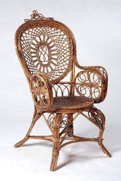 Omålad. Cabrioleben, närmast äggformad rygg med krön. Radiellt flätverk i ryggen, i mitten en oval med sammanflätade åttor, längs ytterkanten enkel fläta. Rund sits. Slåar, x-kryss. Nyrokoko.