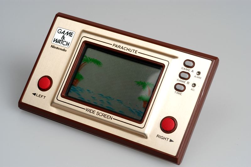 - Dataspel. Batterierdrivet. Till formen rektangulärt och platt, med centrerad bildruta, en knapp för vänster och en för höger rörelseriktning. Panelen är guldfärgad med bruna lister, baksidan av brun plast. Spelet går ut på att fallskärmar faller ner från en helikopter och landar ömsom i havet, ömsom i en båt. Förvaras i originalkartong, med utdragbar frigolitask, av plastat papper, guldfärgad med bild på aktiverad bildruta. Bruksanvisning, garantisedel m.m. finns i kartongen. Kartongen är på insidan märkt med stämplat (serie?)nummer: "00111803", och på utsidans ena kant en vit prislapp: "169.00". Vårdåtgärder: rengjort med pensel.