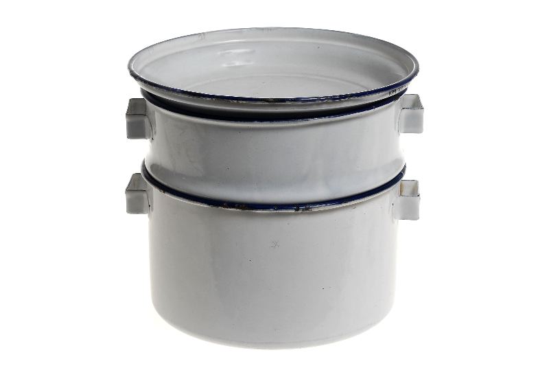 - Tre delar. Vit emalj med blå mynningsrand. En djupare gryta underst, en lägre däröver samt en djup tallrik som fungerar som lock. Grytorna har påsvetsade öron. Den undre grytan cylindrisk, den lägre med liten vulst nedtill för att kunna ställas över den djupare grytan. h(största grytan): 9,8 cm, mindre grytan: 6,5 cm, tallriken 3 cm. Sammanlagd höjd(staplade): 16,5 cm. Maxdiam: 18,2 cm.