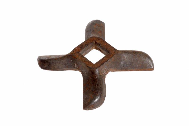 Köttkvarn, gjutjärn, med 4 st. korvstoppningsmunstycken och extra kniv. Helt förtent. Trattformad oval mynning upptill. Skruvfäste till bordskiva. Perforerat munstycke, utbytbart. Vev med trähandtag. I relief på kvarnens sida "HUSQVARNA nr. 10"