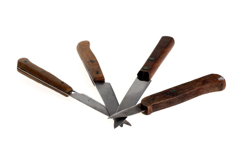 Knivblad av rostfritt stål och brunfärgade träskaft. a.) kort, svängt knivblad inmonterat i ett betydligt längre träskaft. Total L: 14,5 (blad): 4,2