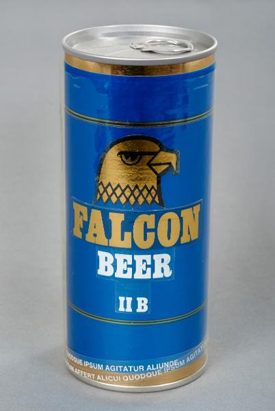 Designförlaga för ölburk; aluminium; cylindrisk burk med avfasade kanter 45 cl; örn i guld monterad på blått papper, Falcon Beer IIB, cellofanomslag ; h 15,5 cm; diam 6,5 cm; formgivare Rune Ohlin; tillverkningsperiod 1970-1990 av PLM, Malmö. Givaren arbetade som tecknare och grafisk formgivare hos Åkerlund & Rausing ca 1955-1960 och på PLM från 1960 fram till sin pensionering 1999. Han har under åren samlat exempel från PLM:s verksamhet i form av original, provtryck, förlagor, oanvända förpackningar mm. Han har även samlat exempel på kollegors formgivning. Han fick bland annat utbildning på ÅR:s atelje där han började på 1950-talet. Han har även arbetat och ställt ut som konstnär, se uppgiftsboken.