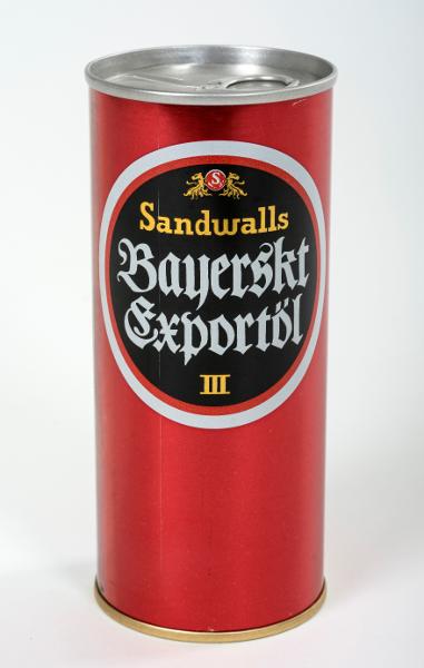 Ölburk; aluminium; cylindrisk burk med avfasade kanter 45 cl; röd botten, text i guld och vitt på svart botten: Sandwalls Bayerskt Exportöl III ; h 15,5 cm; diam 6,5 cm; formgivare Rune Ohlin; tillverkningsperiod 1970-1990 av PLM, Malmö. Givaren arbetade som tecknare och grafisk formgivare hos Åkerlund & Rausing ca 1955-1960 och på PLM från 1960 fram till sin pensionering 1999. Han har under åren samlat exempel från PLM:s verksamhet i form av original, provtryck, förlagor, oanvända förpackningar mm. Han har även samlat exempel på kollegors formgivning. Han fick bland annat utbildning på ÅR:s atelje där han började på 1950-talet. Han har även arbetat och ställt ut som konstnär, se uppgiftsboken.
