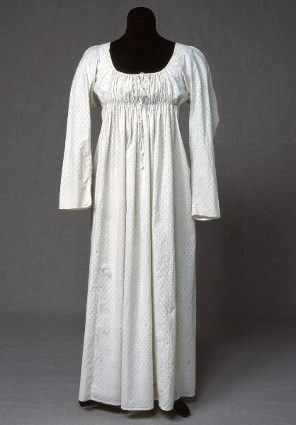 "Klänning av bomull med tryckta regelbundna prickar från omkring 1800. Den är mycket välsydd och en god representant för det tidiga empirmodet."