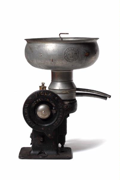 Handdriven med vev; längst upp en rund skål av pressad plåt, nedanför två avrinningshål, via ett kugghjul drivs den s k kulan som är delvis konisk och roterar horisontellt; cylindrisk glasbehållare för smörjolja; de övre delarna är förtenta, nederdelan svartlackerad med guldornament; på vevaxeln sitter en ringklocka.