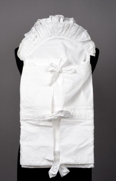 - Rektangulärt, dubbelt stycke (1,15-32 cm) med avrundand huvudände försedd med två rynkade och spetskantade vollanger. 35 cm från fotändan finns en öppning med två tygklädda knappar med handsydda knapphål. Genom denna öppning skall tjockare material stoppas in för att vid ihopvikning bilda madrass och täcke för babyn. På det stora dubbelsydda stycket sitter två mindre rektangulära stycken fästade vid den övre delen. På dessa är sytt tre stycken kanaler för knytband. Knytbandens kortändor är sydda till en spets.