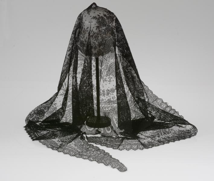 Svart, triangulär, starkt avsmalnande åt sidorna. spets av Chantilly-typ, centrummotiv mitt bak med blomsteruppsats på ömse sidor omgiven av grönska. Motiven plockas upp och upprepas i mindre skala symmetriskt över hela sjalen.