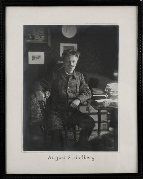Reprofotografi med glas och svart träram. Föreställande August Strindberg sittande vid ett skrivbord med armen på stolsryggen och andra armbågen på bordet, vänd mot fotografen. På bordet högar av papper. Under fotot texten: "August Strindberg".