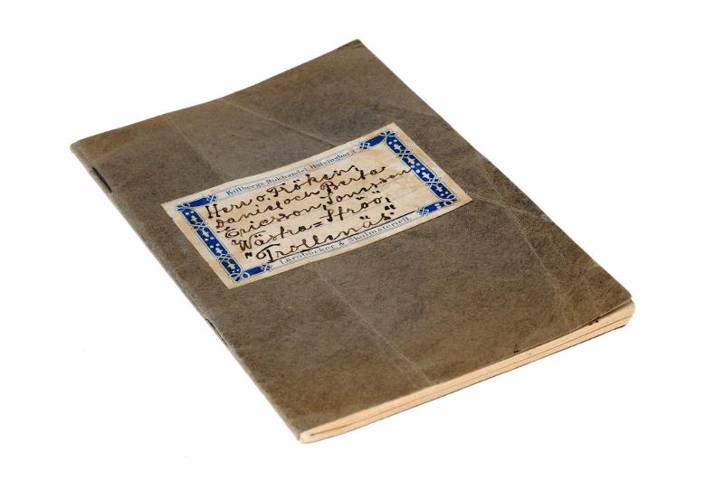 STLM 5735. Anteckningsbok. Anteckningsbok med ursprungligen blå pärmar, framsidan blekt till grön. Etikett på framsidan med blått tryck på vitt: Killbergs bokhandel Hälsingborg, Läroböcker & Skolmateriell. Handskriven text med svart bläck på etiketten: Herr och fröken Daniel och Berta Ericsson, Sonesson Wästra=Ströö, "Trollenäs". Anteckningssidorna randade, fyllda med handskriven text med svart bläck skriven i långa, utdragna stycken. H 16,5 cm. B 10 cm. Funnen omärkt i samlingarna vid inventering 2009.