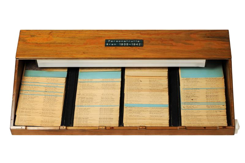 Personalrulla i mörkblå vikpärm. Är fyrdelad och varje del rymmer drygt 60 personalkort. Personalen är via blå ledkort uppdelad i olika kategorier.