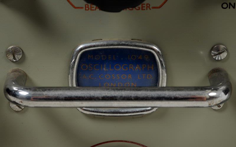 Ena kortsidan har ett flertal rattar med visare. Kvadratisk utbyggnad med glaslins. Metallhandtag. Märkt i guld på blått innanför plast: "Model 1049 Oscillograph,A C Cossor Ltd, London". Även märkt på ovansidan: "Steinhardt Ingeniörsfirma , Stockholm". Ovanpå finns oval försänkning med handtag av läder. Långsidorna har långsmala nedåtgående öppningar samt en stor öppning i ena långsidan. Baksidan är perforerad. Svart färg, grå metall under reglagen.