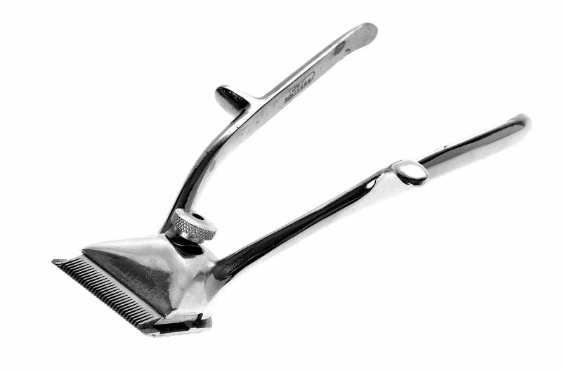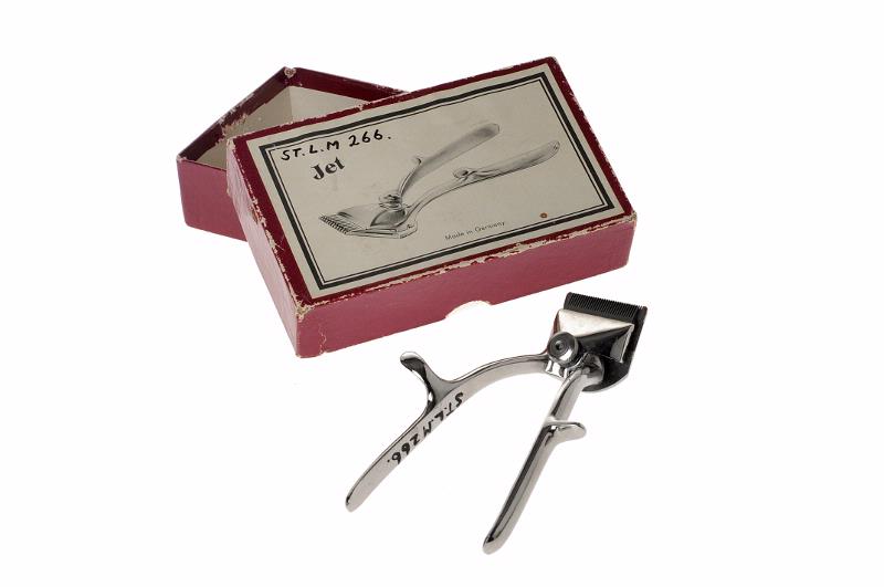 STLM 266.Maskinsax. L 13.5 cm, B 6.5. Maskinsax är gjord av rostfritt. Används för att klippa nackhår. Förväras i en vinröd pappask. Märkt: JET SOLINGEN
