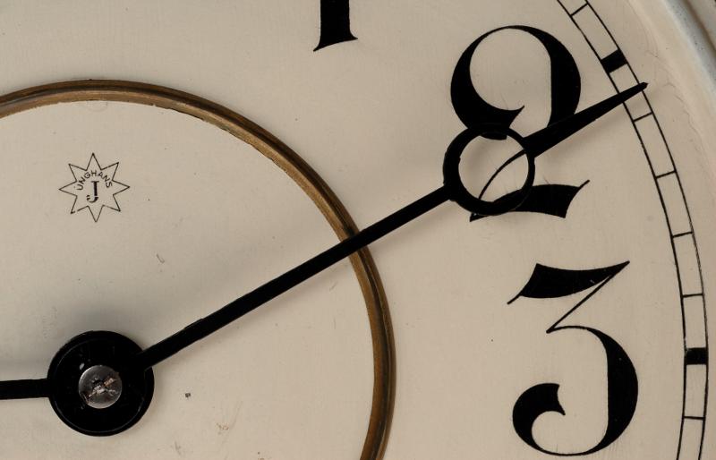 Runt. Glaset framför urtavlan infattat i mässing. Vitmålad urtavla med svarta siffror och visare, märkt ( Junghans). Kring tavlan profilerad ram av ljust trä. Bakstycket 8-kantigt, etikett: " Buenos Aires 10 No 549 14 tag Gehwerk" och stämpel "JUNGHANS ( i stjärna) ORGINAL". Nyckel finns.