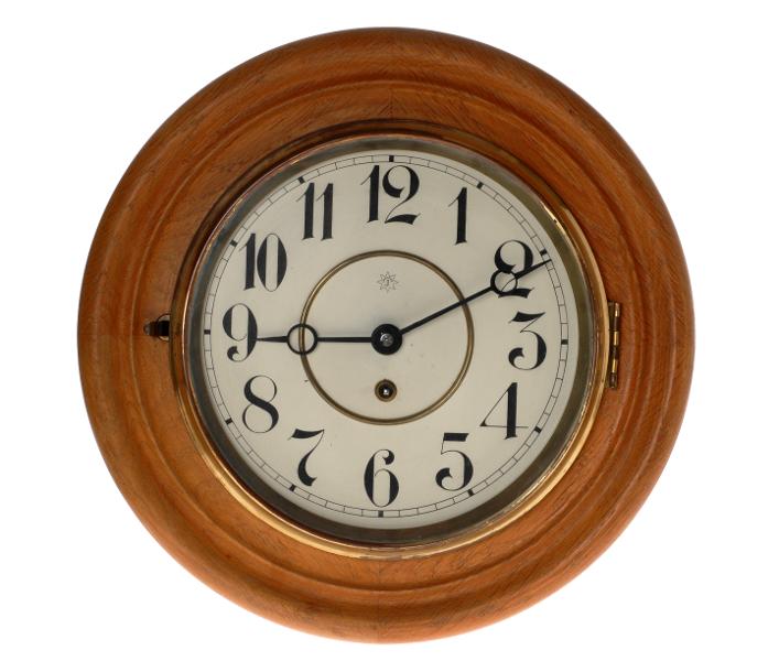 - Runt. Glaset framför urtavlan infattat i mässing. Vitmålad urtavla med svarta siffror och visare, märkt ( Junghans). Kring tavlan profilerad ram av ljust trä. Bakstycket 8-kantigt, etikett: " Buenos Aires 10 No 549 14 tag Gehwerk" och stämpel "JUNGHANS ( i stjärna) ORGINAL". Nyckel finns.