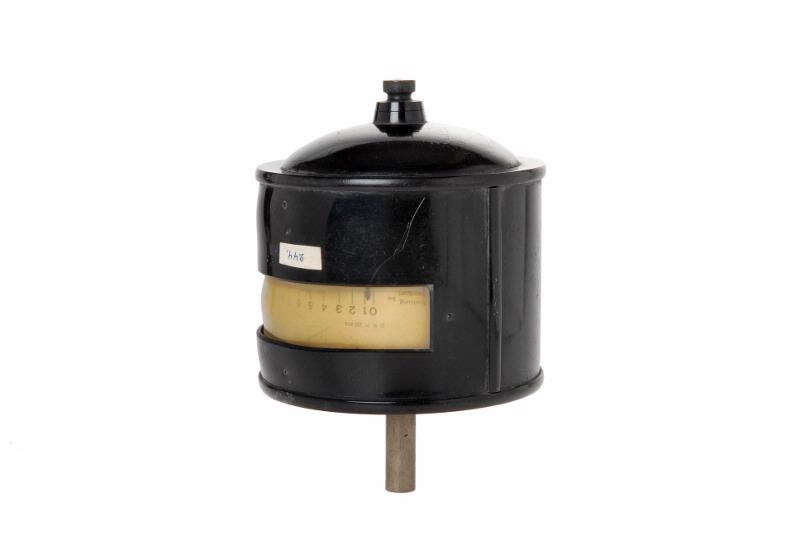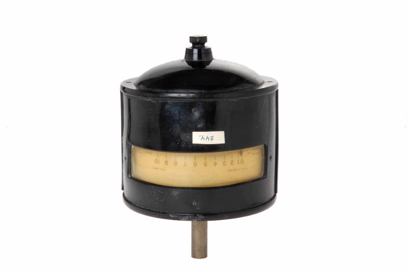MS 6258. Spänningsmätare, qualimeter, enl Heinz Bauer, troligen celluloid samt metall. Rund, svart dosa av celluloid med metallrör i ena änden. Gul skala 0 - 10 under genomskinlig celluloid. För spänningsmätning vid rtg-behandling. Fabr. Heinz Bauer, Berlin, 1911. Nr 244. Fastbunden etikett, delvis oläslig. Cylinderns L 1 190 mm. D 135 mm.