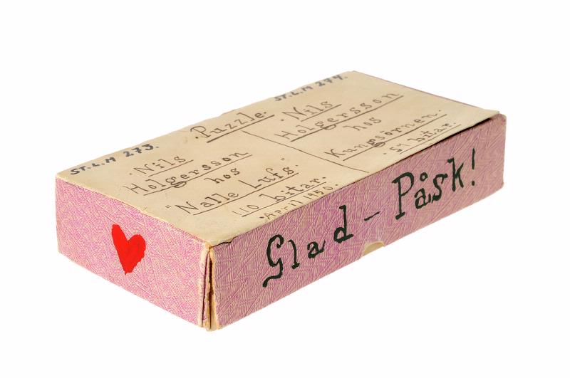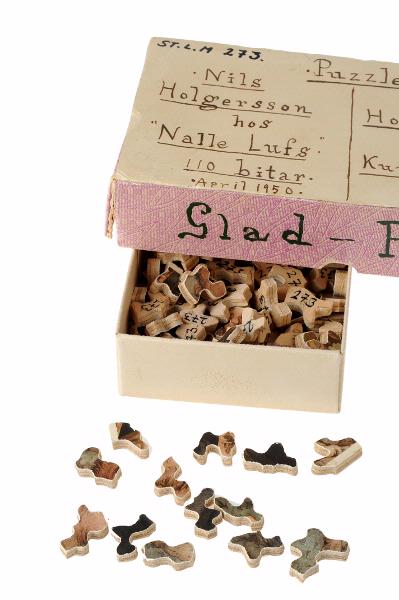 STLM 273. Pussel. Nils Holgersson hos Nalle Lufs. Pussel med 105 bitar, det har från början varit 110 bitar. Förvaras i en ask tillsammans med ett annat pussel. Troligen terapiarbete.