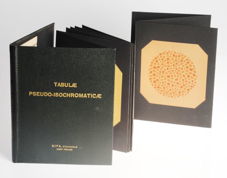 - 16 st planscher för färgsinnestest. Hänger ihop som ett dragspel i en bokpärm. Pärmen har text: "Tabulae pseudo-isochromaticae, B.-K., KIFA Stockholm (Eget förlag)". Pärmen innehåller även en bruksanvisning.