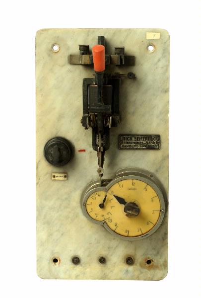 - Metallstativ med reglage. Gradering i celluloid. Gemensam metalldosa. Strömbrytare i bakelit. Reglagehandtag i orange bakelit. Nämnda delar sitter i platta av ljusgrå marmor. Märkt "Rich. Seifert & Co. Elektrotechn. Fabrik, Hamburg-Lüneburg nr 9" i grönt bläck på etikett. Hål i marmorskivan för skruvar. Trycker man in reglagets två hakar i passande skåror kan man få de två visarna att rotera, om man först vridit den stora visaren till önskat sekundtal.