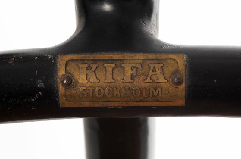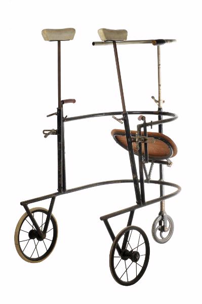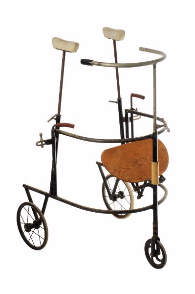 MS 6263. Gångvagn. Av metall, trä, gummi, läder och filt. Järnram i form av två bågar över varandra. Den övre bågen är något kortare och sitter på den undre. Metallhandstöd med röda gummitutor. Från den undre bågen ugår två större hjul med ekrar, bakhjul, medan ett mindre hjul längst fram i mitten sitter nederst på en styrstång. Det ena svarta gummihandtaget saknas. Från den undre bågen utgår två kryckstöd, skinnklädda upptill, och som kan regleras. Längst fram finns träsits på järnstativ, också utgående från undre bågen. Runt styrstångens mellersta del sitter ett hölje av ljus filt. L 960 mm. Br 780 mm. H 1240 mm. Märkt "KIFA, Stockholm" på mässingsskylt samt "R 65" på annan metallskylt.