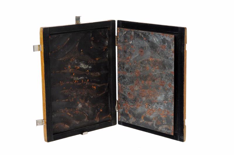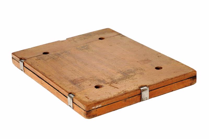 Använd in på 1920-talet enligt medföljande etikett handskriven med bläck. Två träplattor förenade med gångjärn. Den ena plattan har plåtskiva monterad på fjädrande underlag. Kassetten stängs med fyra metallhakar. För plåtar 18x24 cm.