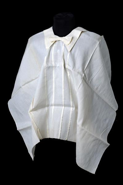 VS 732. Blus: Framsida till blus av finaste vita linnekvalitet. Spetsiga kragsnibbar, lodräta veck på bröstet; två dekorationsknappar på bröstet; fluga under kragen.