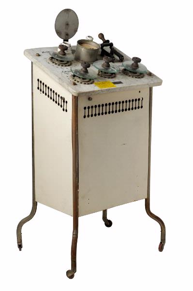 MS 6426. Regleringsbord för röntgenterapi. Använt på 1930-talet. Fabrikat: B E Järnh. Av marmor, plåt, glas och porslin. Medföljande maskinskriven etikett. Svagt snedställd marmorskiva med reglage i bakelit och glasrundlar för "motor", "grovreglering", "induktion" och "finreglering". Även ampère-skala i metalldosa utan glas. Två porslinshållare för elproppar, varav en sitter i. Handtag, "induktor". Längst upp, baktill vertikalt fastsatt, rund metallplatta. Underrede bestående av fyra ben med hjul. Inbyggda sidor av vitlackerad plåt, perforerade upptill. Marmorskivans L 550 mm. B 450 mm. H upp till och med skivan 1040 mm. Tot H 1230 mm.