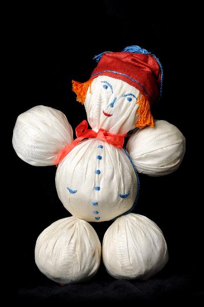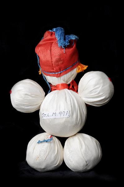 STLM 991. Tygdocka. Längd: 23 cm. Tygdocka gjord av 6 st. klotrunda vita tygbollar kläda i rod toppluva med blå tofs. Har orangefärgat garn till hår samt röd sidenbandsrosett.