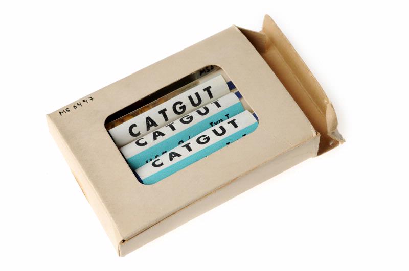 - 5 st behållare ligger i ofärgad kartong med öppen ruta i var sida, 2 st ligger i annan kartong, 3 st saknas i denna. Behållarna är plomberade och innehåller catgut i sterilvatten. Turkosa etiketter.