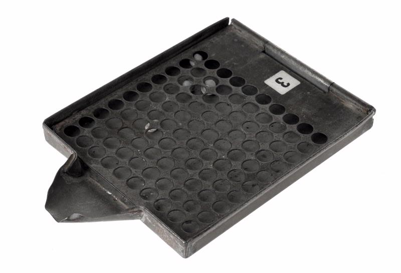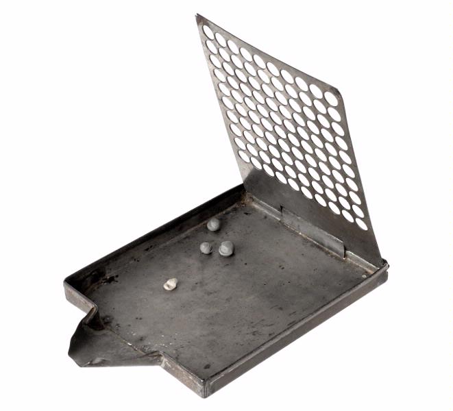 MS 268. Pillerräknare. L 152, B 99 mm. Pillerräknare av metall 4- kantig, låg, "skål" med "pip" för avhällning. Såll, 100 hål, fäst med gångjärn.
