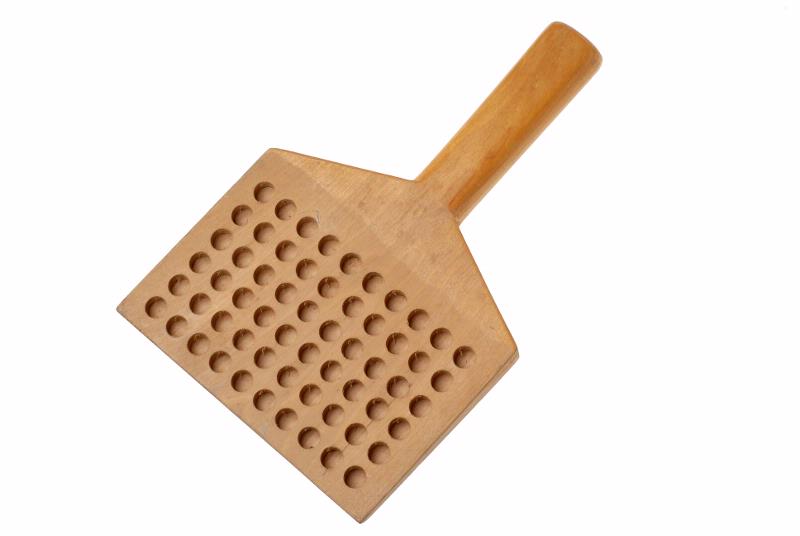 MS 270. Pillerräknare. L 258, B 168 mm. Pillerräknare av trä. Platta med skaft, 60 hål.