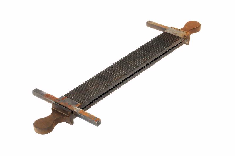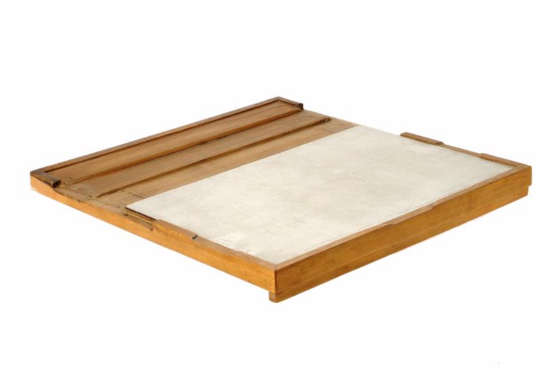 MS 284. Pillermaskin. L 505, Br 48 mm = övre järnet. 370 x 363 mm = plattan. Plattan klädd med "perstorplatta". Undre skärjärn defekt.