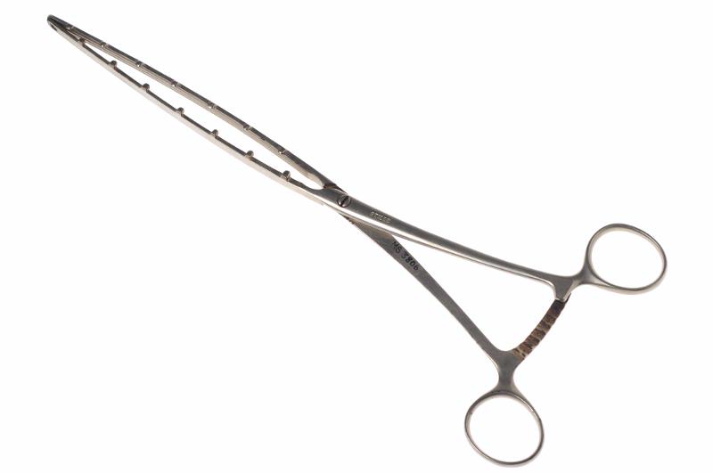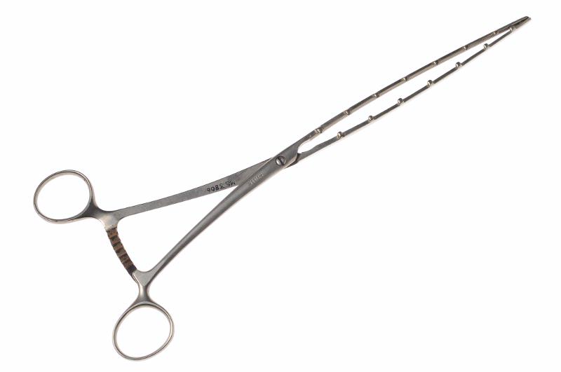 MS 3806. Tarmklämmare, enligt Kocher-Payr. L 270 mm. Med knoppar, fjädrande, rak, stål, märkt STILLE, Kir.op. Gåva från Kirurgiska kliniken, op.