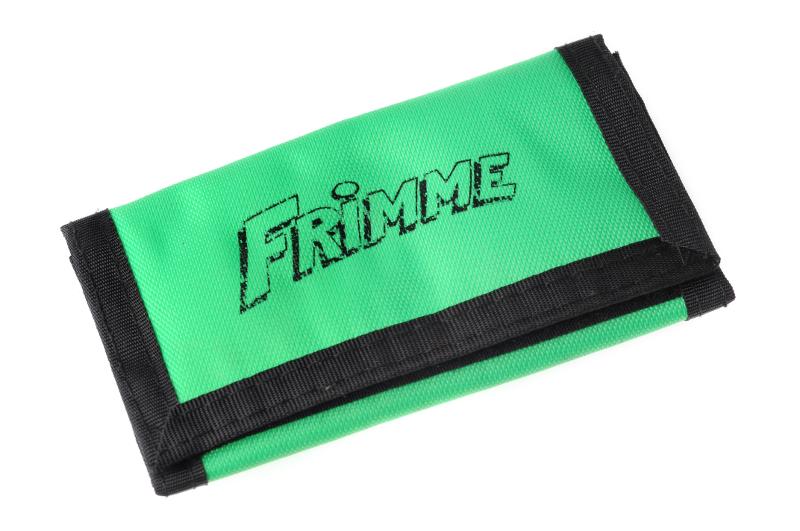 VS 1046. Grön plånbok med svarta revärer. Kardborrknäppning. Text: "Frimme". B. 63, H. 113. Har tillhört Nils [utelämnad uppgift], f.d. Vipeholmspatient. Samhör med VS 1026-1090.