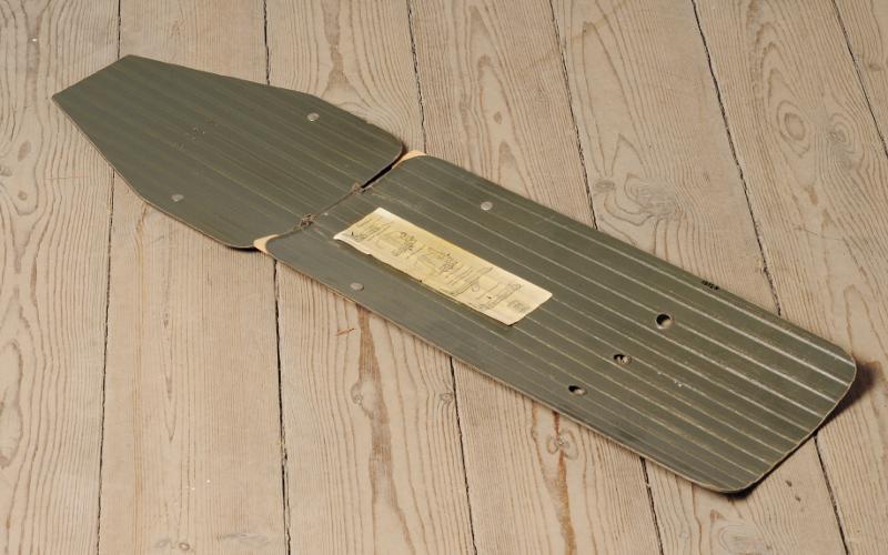 - Brungrön med 2 vingar. 3 hål i den längre delen, 2 runda stöd i den mindre delen. Avlång vit etikett med svart text visar med bilder skenans användningsområden vid frakturer. Märkt: "AB Bofors Nobelkrut Bofors - Sweden".