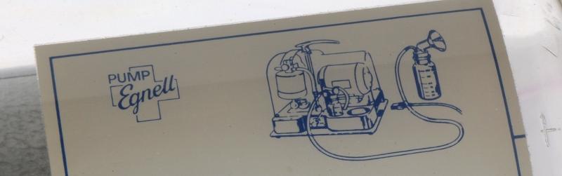 H 5430. a) Bröstpump. Elektriskt driven, av metall och genomskinlig hårdplast, med elektrisk motor. 2 flaskor och 1 tratt. Märkt: "PUMP EGNELL PUMPAB EINAR EGNELL TROLLHÄTTAN SWEDEN MOD20 200/250V 50 C/S 60W". Bruksanvisning på skyddskåpa av plast. L 297 mm Br 233 mm H 225 mm b) Bord. Av metall med 2 ställningar. Av förkromad stål. Diam övre platta 365 mm Diam nedre platta 233 mm H 56 mm. Gåva från Barnkliniken.