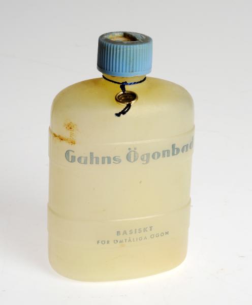H 5283. Plastflaska för ögonbadvätska. Plastskruvlock och plastskål för bad. Märkt: "GAHNS ÖGONBAD BASISK FÖR ÖMTÅLIGA ÖGON HENRIK GAHNS AKTIEBOLAG UPPSALA".