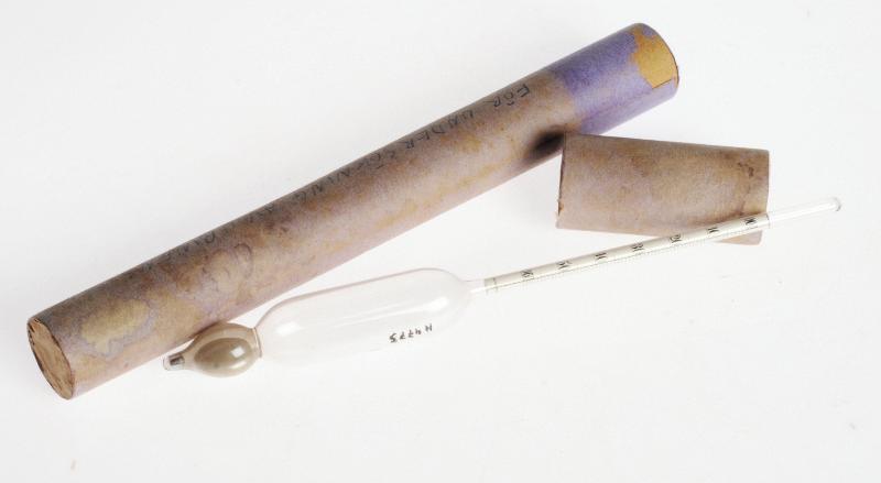 H 4775. Urinometer med kvicksilver med 2 hylsor graderad av glas. L 185 mm. Förvars i en pappetui L 215 mm, Diam 22 mm. Gåva av Marianne Follin.