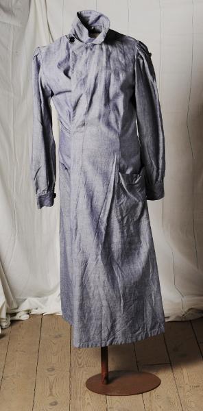 H 4924. Sjuksköterskeklänning i marinblå/vitt bomull med 2 delad framsida utan knappar, med omlottsband i midjan, med 2 fickor på kjolen, med krage.