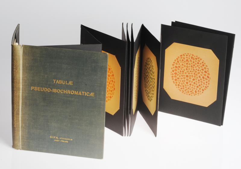 H 5674. Tavlor för färgsinnesundersökning. I omslag av plast märkt: "TABULAE PSEUDO-ISOCHROMATICAE KIFA STOCKHOLM (EGET FÖRLAG)". L 194 mm Br 152 mm.