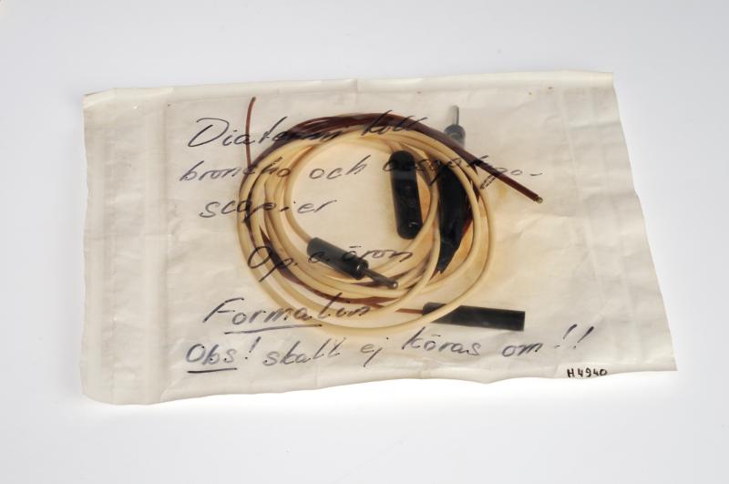 H 4940. Kabel till diatermi till broncho och oesophagoschopier. 2 stycken, en vit och en brun av plast.