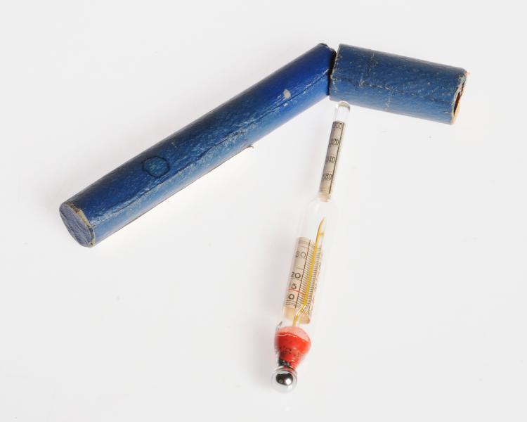 H 5919. Urometer M 5. Av glas. Graderad från 1,00 till 1,060. Märkt: "Sp. V Tp 15 grd C". L 115 mm. Gåva från Öronkliniken avd. 45.