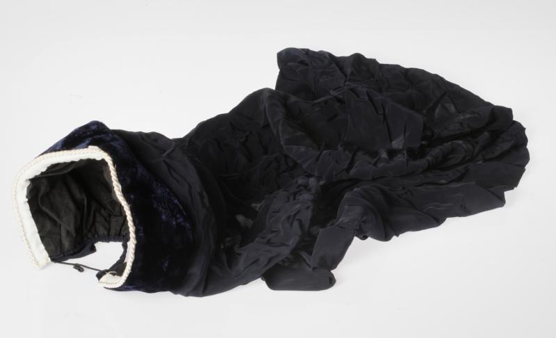 H 5925.3. Högtidsslöja. Av marinblått silke med sammetsband och flätat band av vit bomull. Gummiband under hakan. Rynkad nertill. Mössa bärs under. Ursprung Södra Sveriges Sjuksköterskehem. Gåva av Raija Hansson.