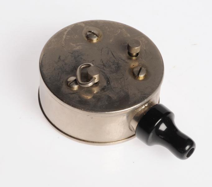 H 6557. Larmtrumma Barany av metall och ebonit. Diam 57 cm. Gåva av anonym givare 29/7-98.