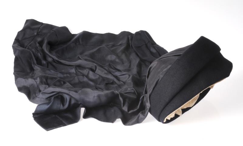 H 6595. Mörkblå hatt i filt med dok i kraftigt tyg. 4 veck på doket. Hatten går ner i en liten snibb mitt fram. PUB, Stockholm. (Sofiahemmet Ingeborg Bredberg).