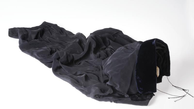 H 6598. Mörkblå hätta med dok i chiffon blå sammteskant. Mattsons i Lund. Gåva från Marianne Wihlborg. SSSH