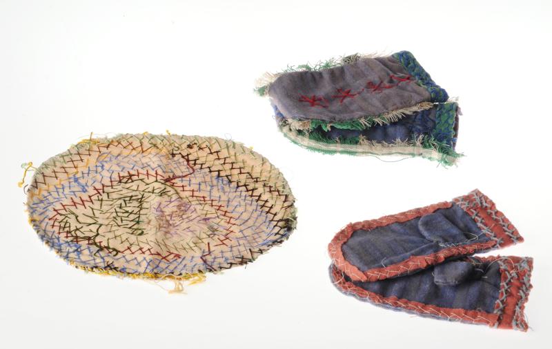 d) Hätta med knytband, sydd av oblekt lakansväv med broderade strofer ur svenska sånger och psalmer. Ex. "Jag äter socker dricker vin därför är jag så fin".