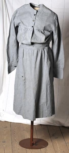 Ljusgrått intryck men är egentligen mycket smått rutig i vitt och svart. Skuren i midjan, blusen och kjolen rynkade i midjan. Framstycke med svarta knappar. 2 fickor: en på blusen och en på kjolen. Märkt: "ELLA PERSSON".