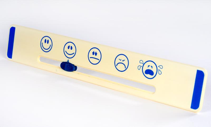 - Analog skala på vilken en markör kan justeras i sidled för att ange den upplevda smärtgraden. På ena sidan fem figurer med olika ansiktsuttryck som anger fem smärtlägen - från glad till ledsen. På andra sidan en motsvarande skala från 0-100.