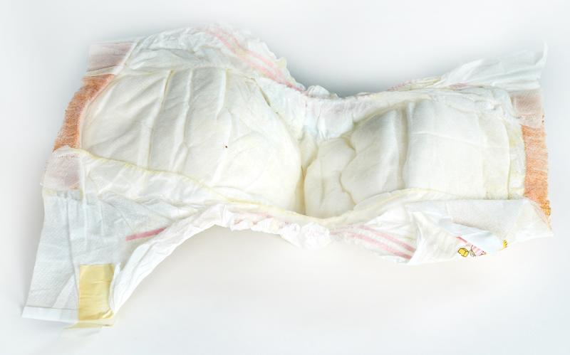 H 6908. Blöja. Material: plast. Vit blöja som spänns med tejp i midjan. Bilder av lekande barn längs med linningen. Tillverkare: Libero, 1990-tal(?). Modell: Midi. Funnen omärkt vid inventering 2014.